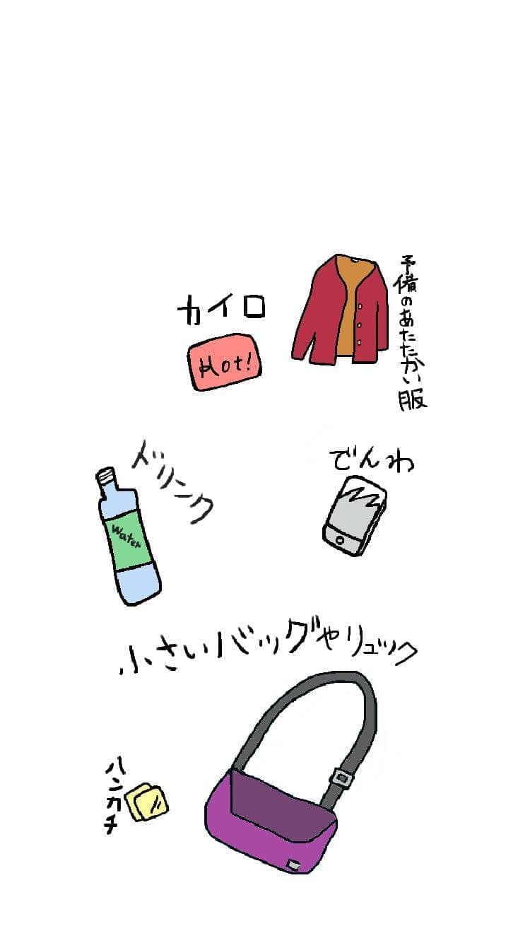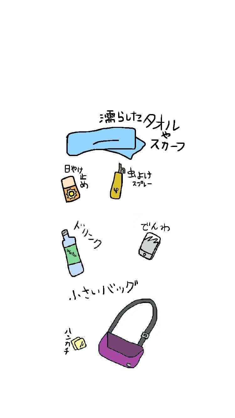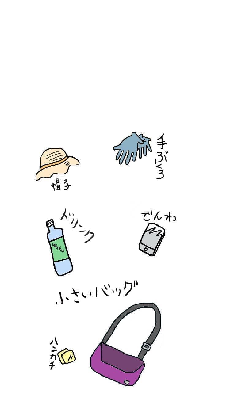 季節や天候、暑さ・寒さに対応した服装、靴(ハイヒール不可)※必ずご自身で当日の天気予報や気温をご確認の上ご対応下さい。